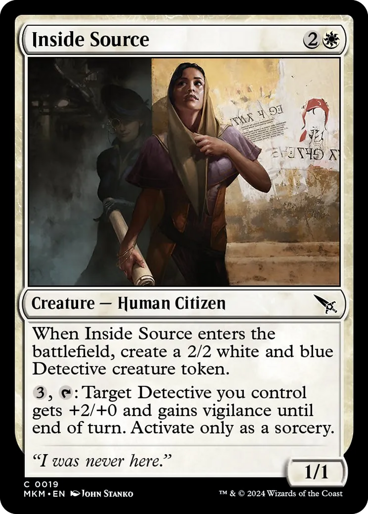 When Inside Source enters the battlefield, create a 2/2 white and blue Detective creature token.